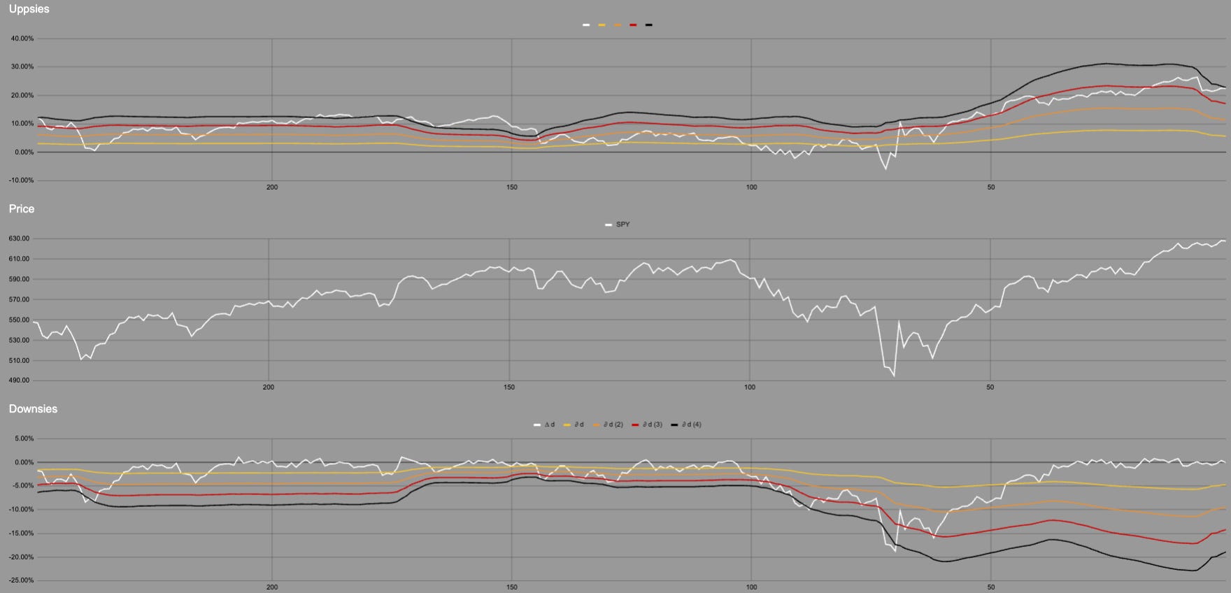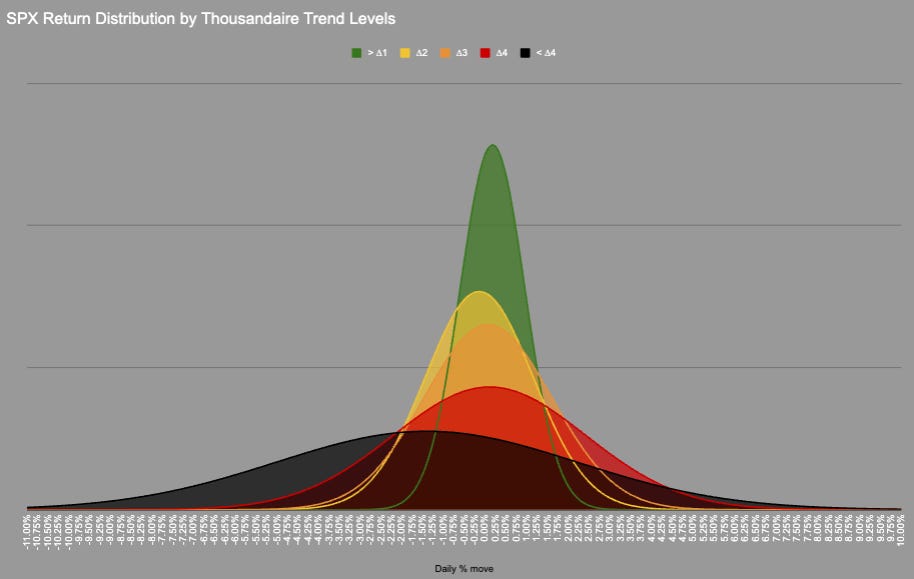We remain in the green zone where SPX spends 65% of its trading time. This zone has a narrow but positively skewed distribution.
