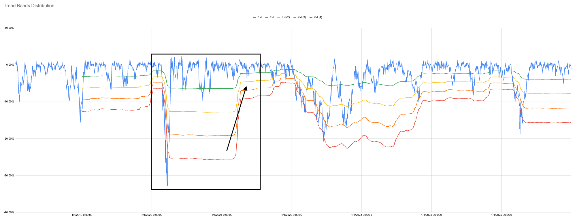 I think the more likely outcome is a compression of volatility. As April 2025 becomes an ever smaller part of the look back window it will force a compression of what we use here which are trend lines/bands.