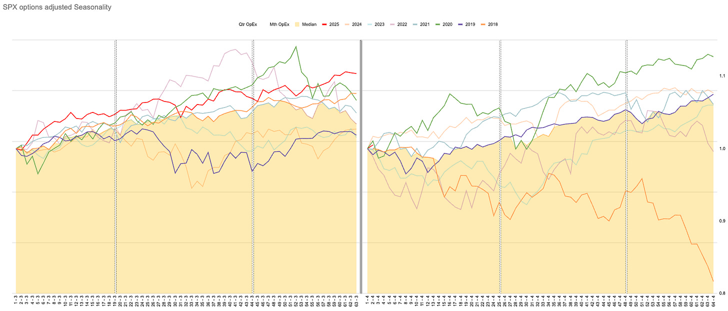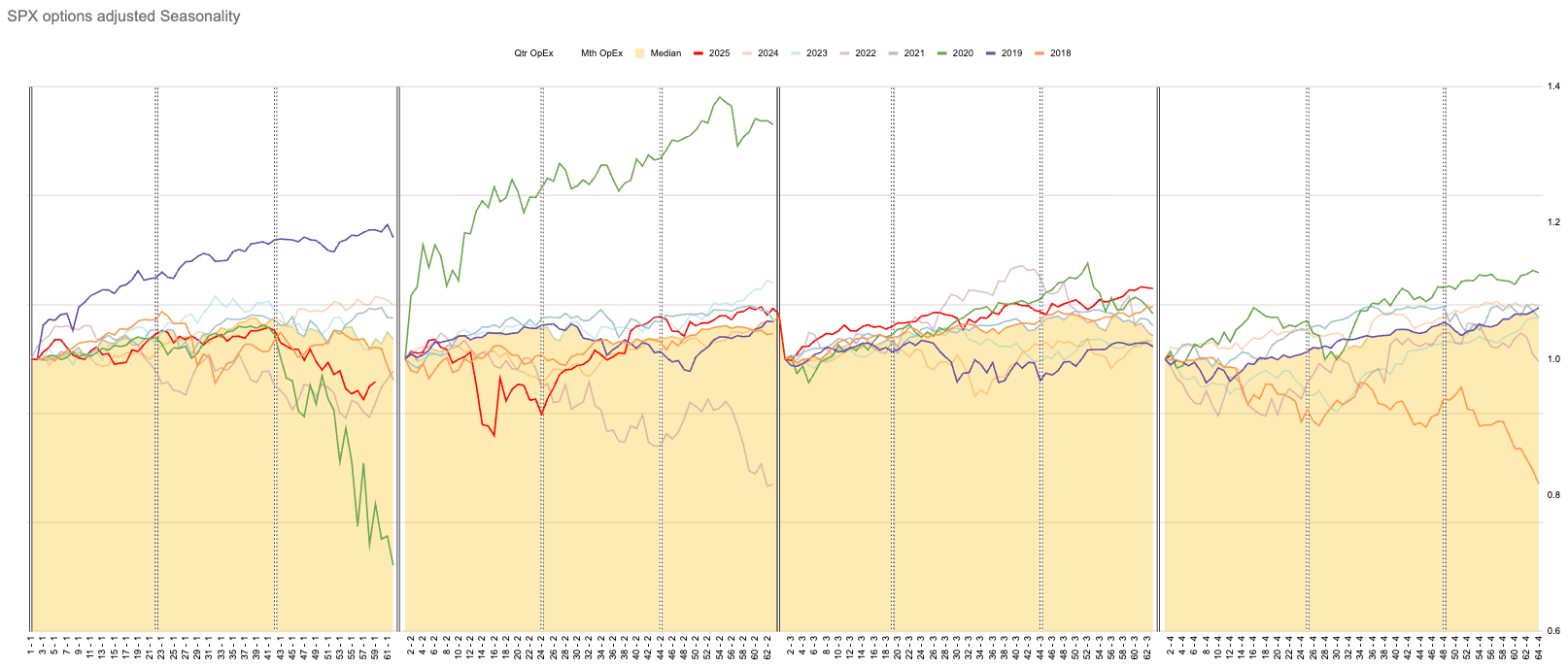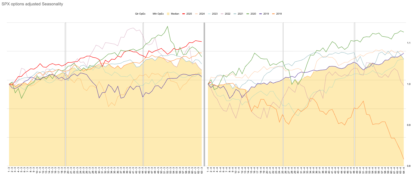 We remain in the green zone where SPX spends 65% of its trading time. This zone has a narrow but positively skewed distribution.