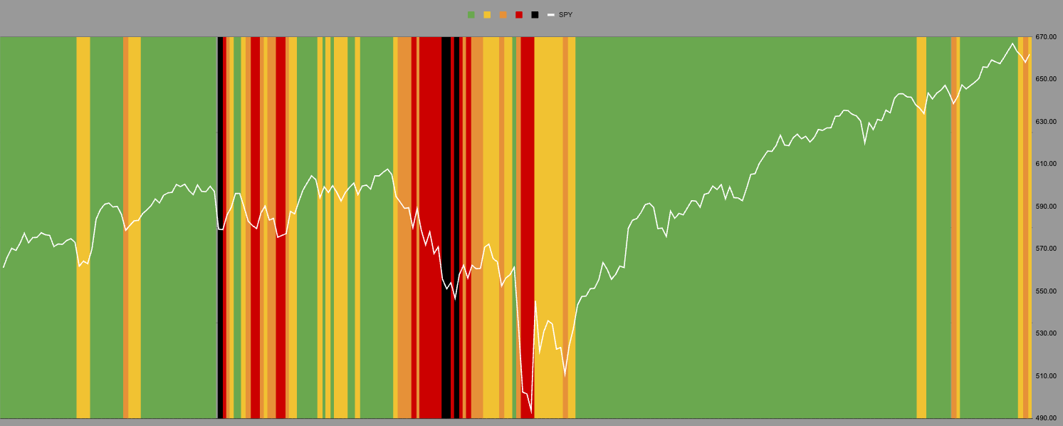We remain in the green zone where SPX spends 65% of its trading time. This zone has a narrow but positively skewed distribution.
