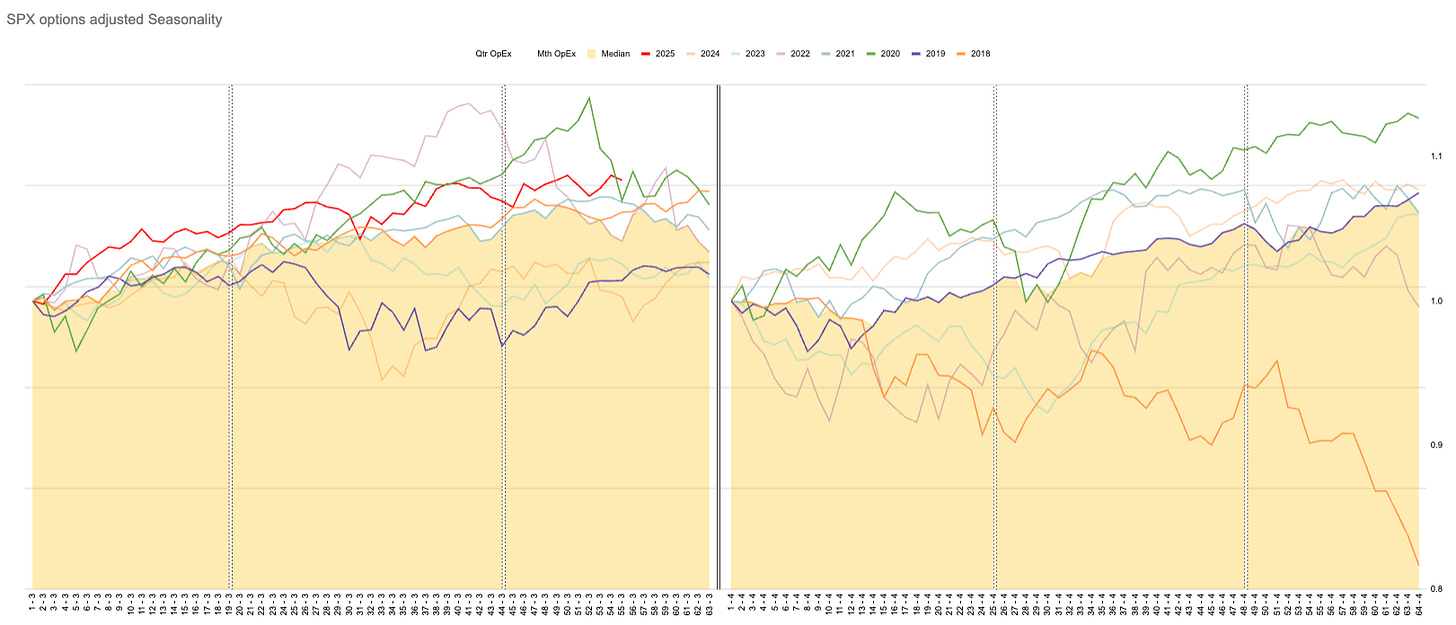 If we look at options adjusted seasonality August to October passing through the large September OpEx often sees some weakness. Remember it doesn’t have to be a -20% bloodbath it could just mean nothingness. Within that index nothingness the internals would be free to move around the cabin.