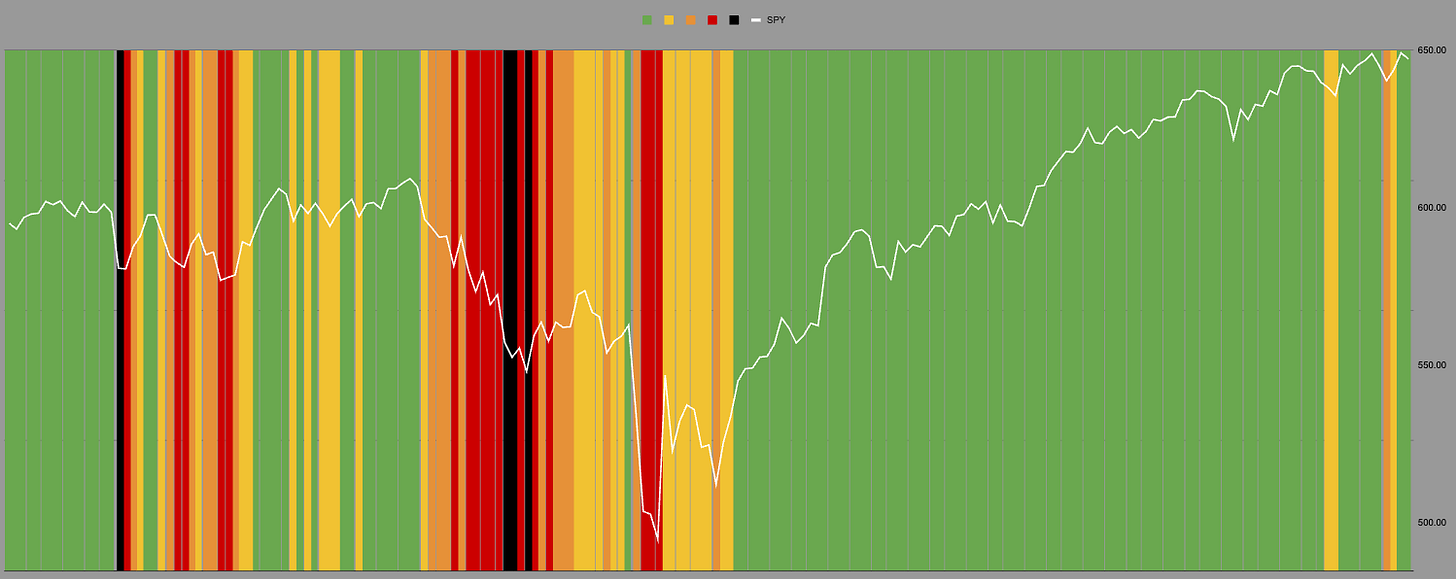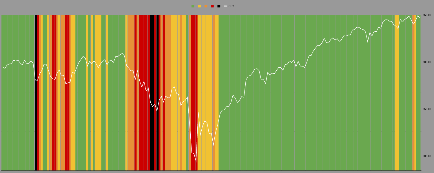 We remain in the green zone where SPX spends 65% of its trading time. This zone has a narrow but positively skewed distribution.