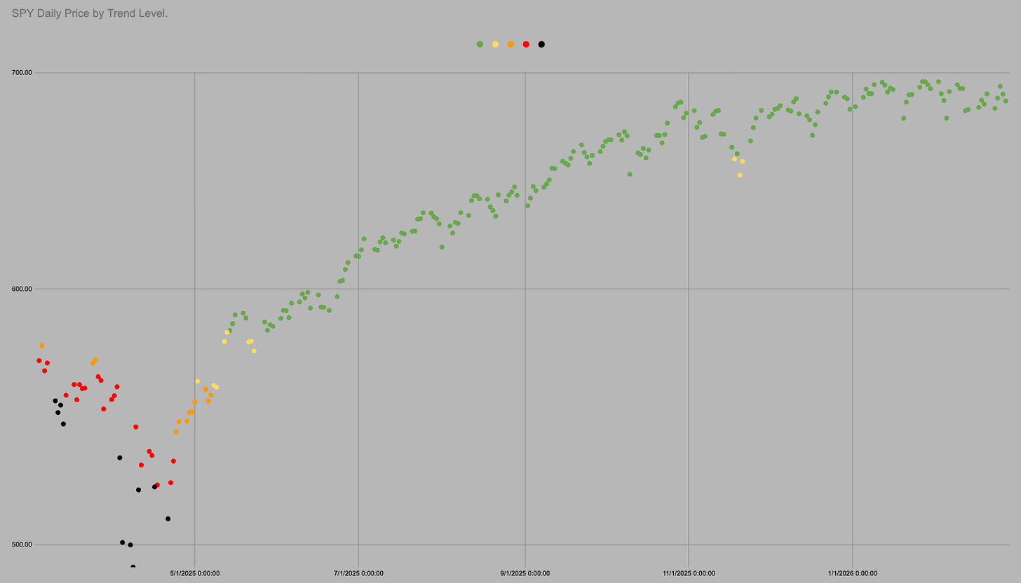 It is all the same chart so I can use all the same data. In the last 1761 trading days SPY has been above “trend” i.e. in green or yellow 83% of days.