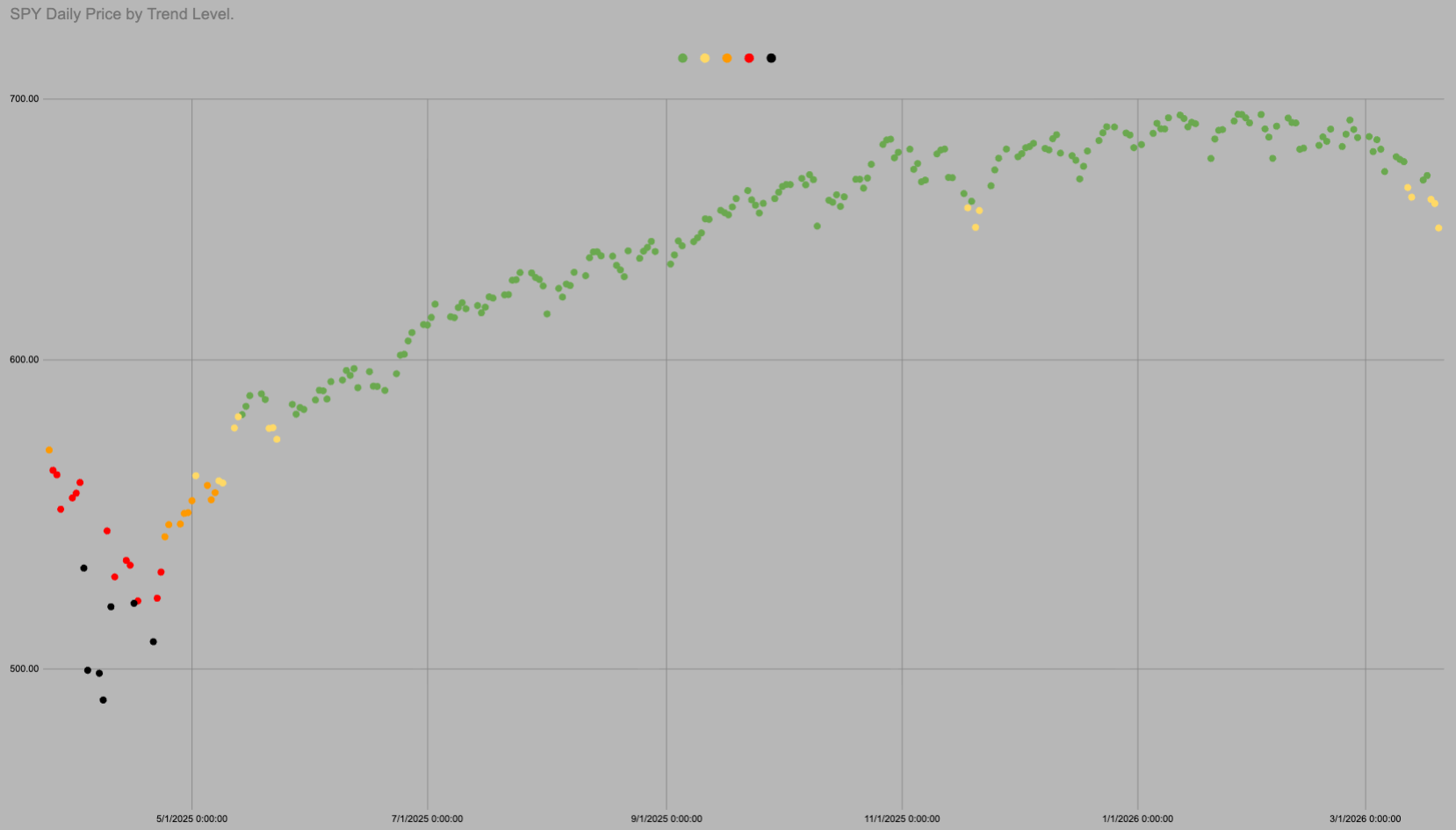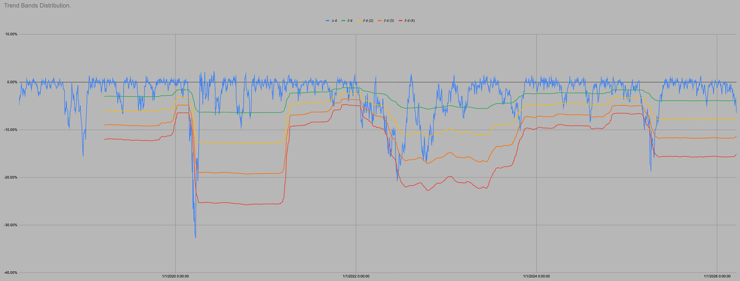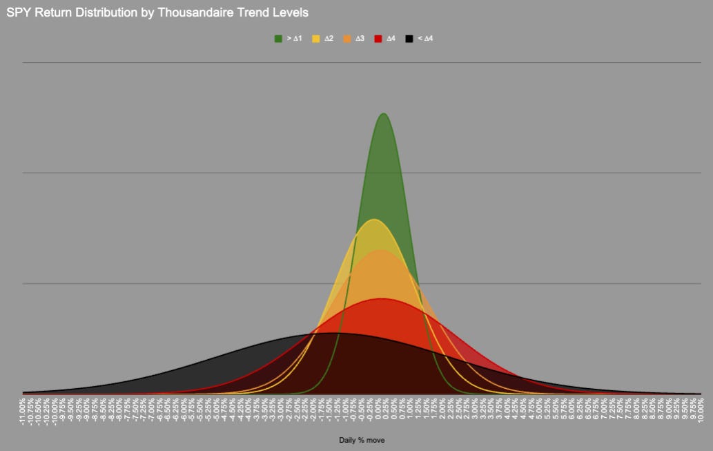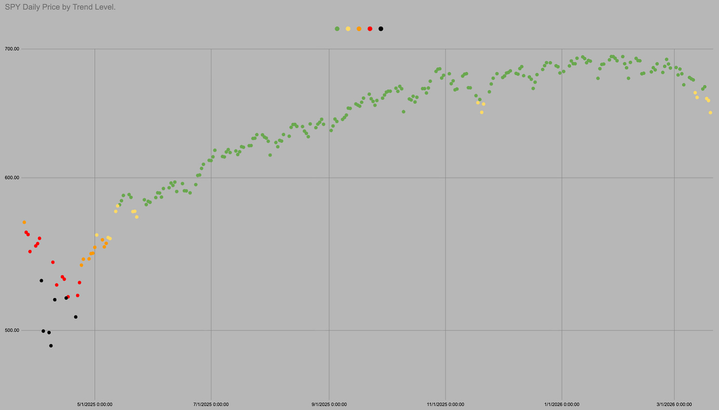 It is all the same chart so I can use all the same data. In the last 1761 trading days SPY has been above “trend” i.e. in green or yellow 83% of days.