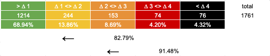 In 1761 trading days price has never moved directly from Green into Red/Black there is always an intermezzo hangout in Orange.