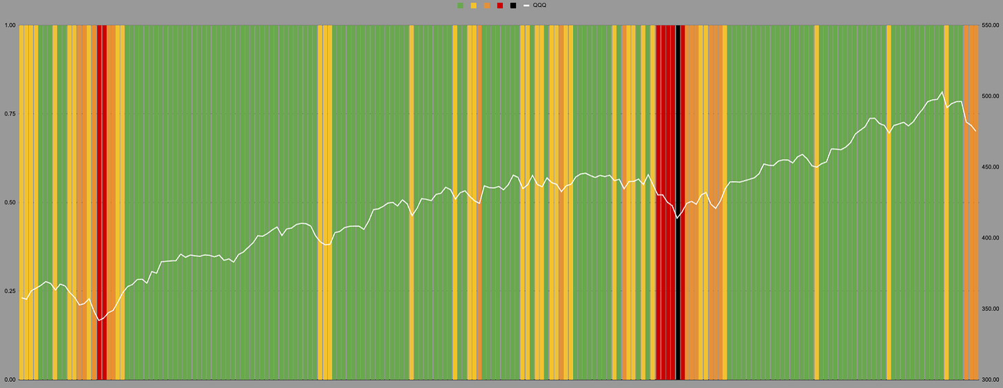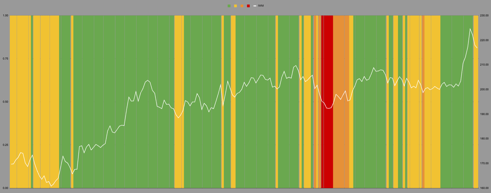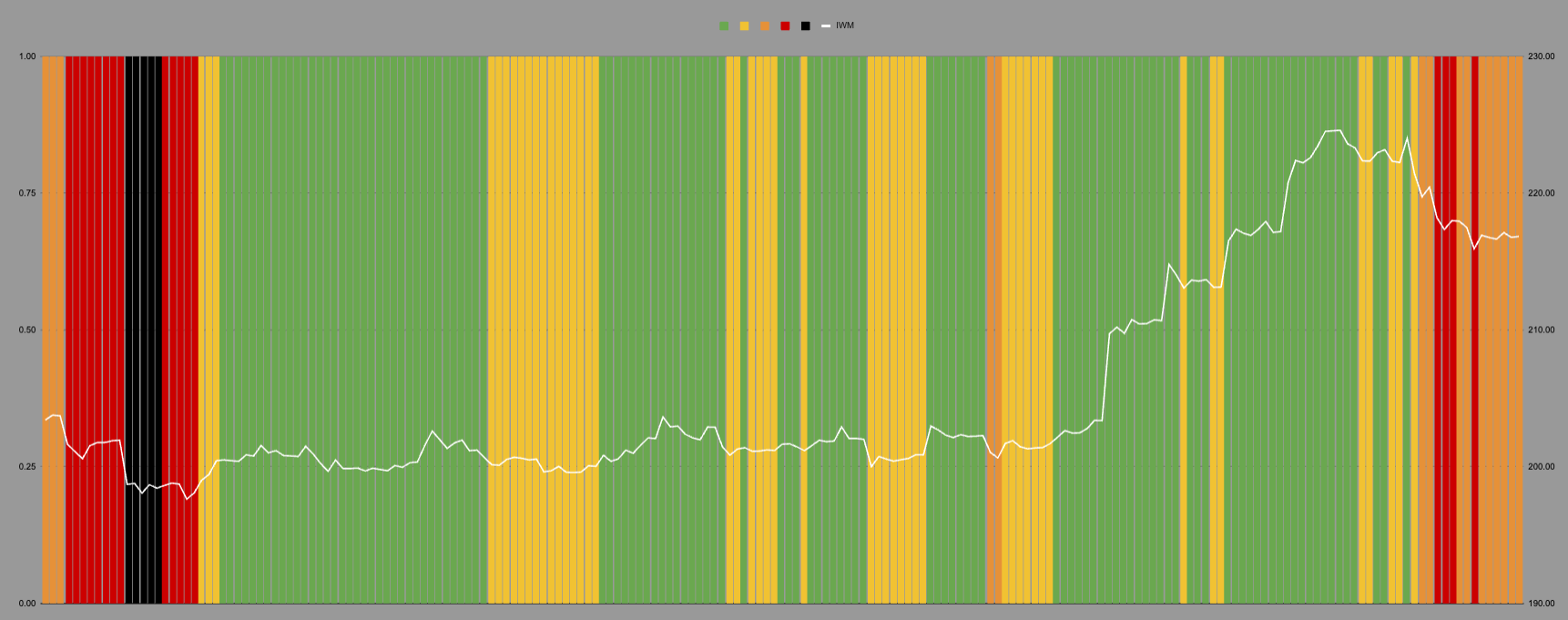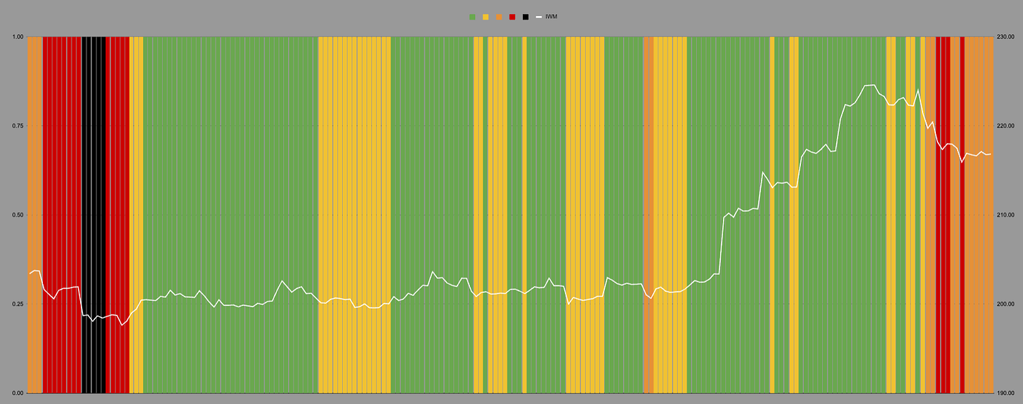 IWM on the hourly measure hit the dreaded black line of doom. This often coincides with maximal bear porn. It did not hit quite as badly on the daily, but this was still a level where IWM spends less than 15% of its time.