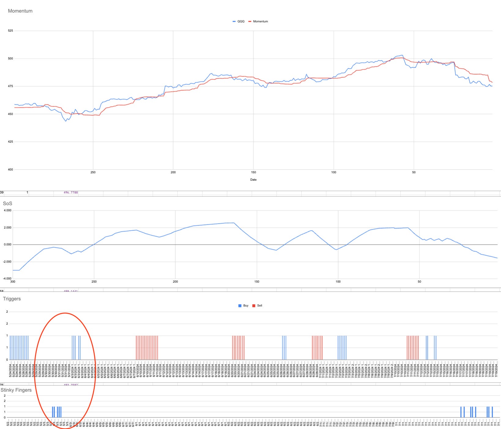 “Stinky Fingers” has triggered on QQQ hourly but moves are more meaningful when the triggers come in pairs.