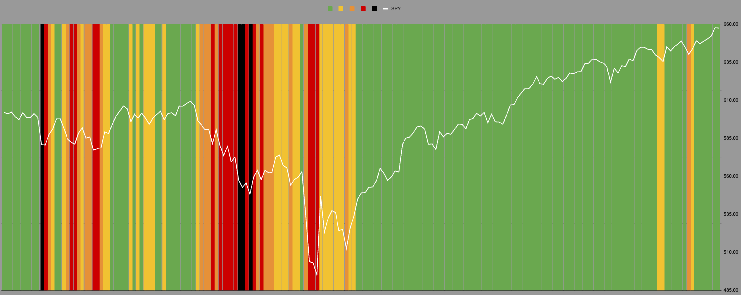 We remain in the green zone where SPX spends 65% of its trading time. This zone has a narrow but positively skewed distribution.
