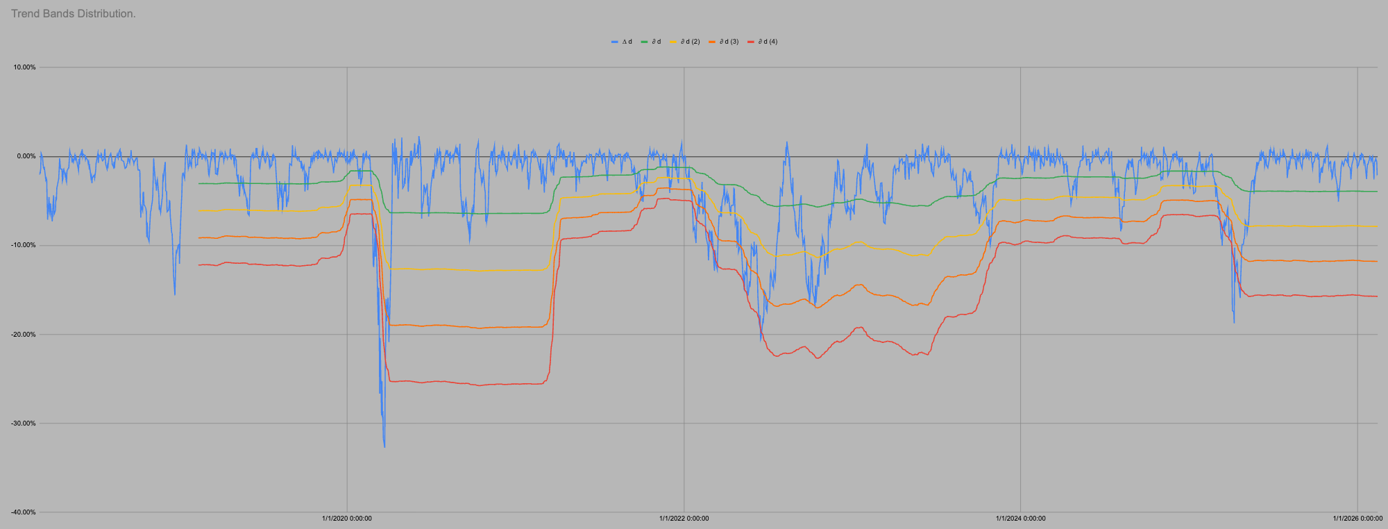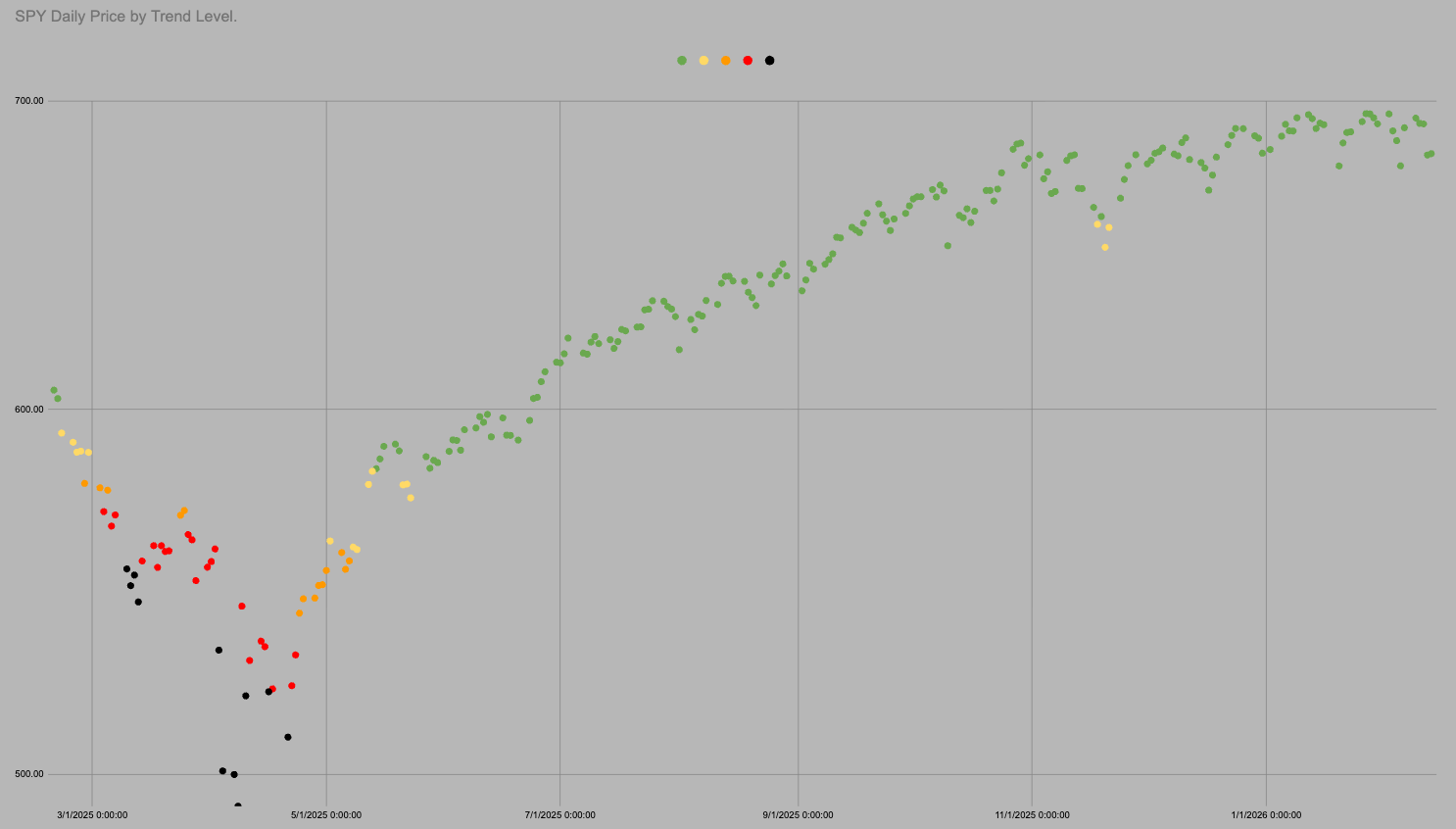 It is all the same chart so I can use all the same data. In the last 1761 trading days SPY has been above “trend” i.e. in green or yellow 83% of days.