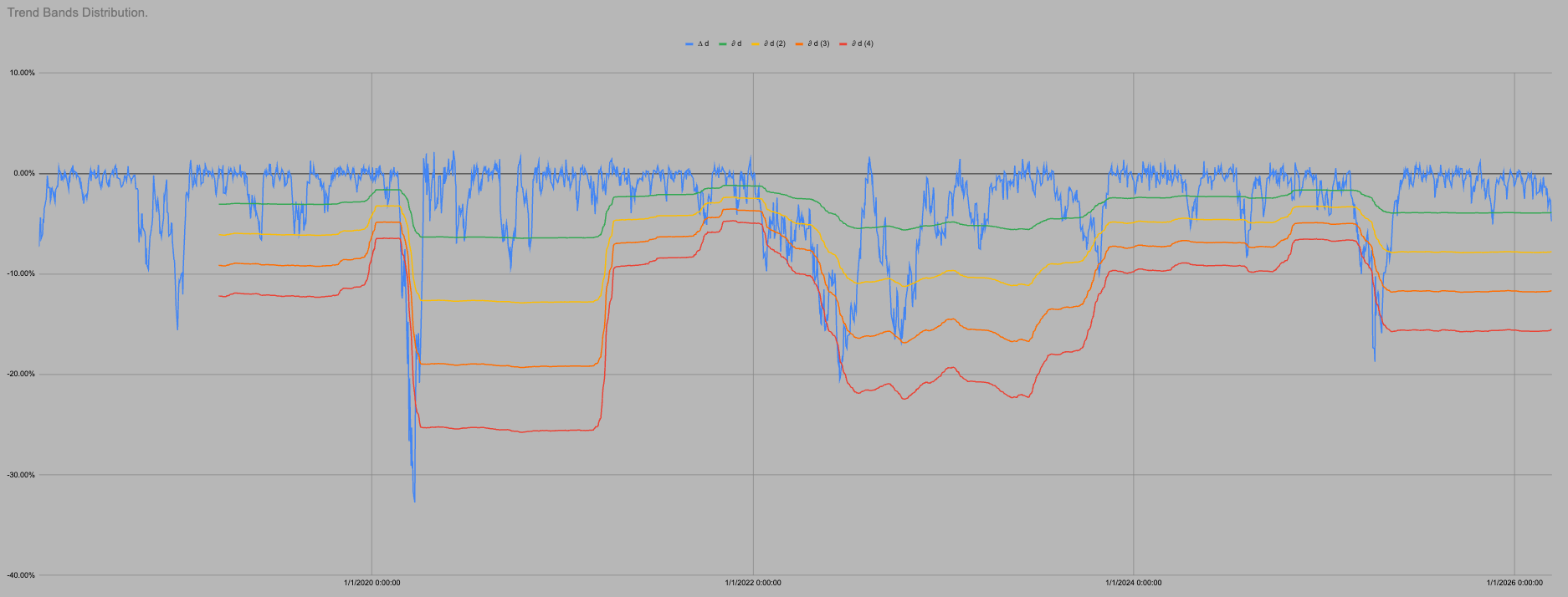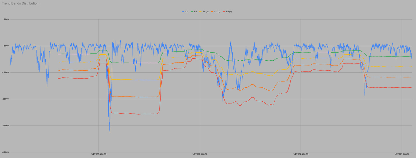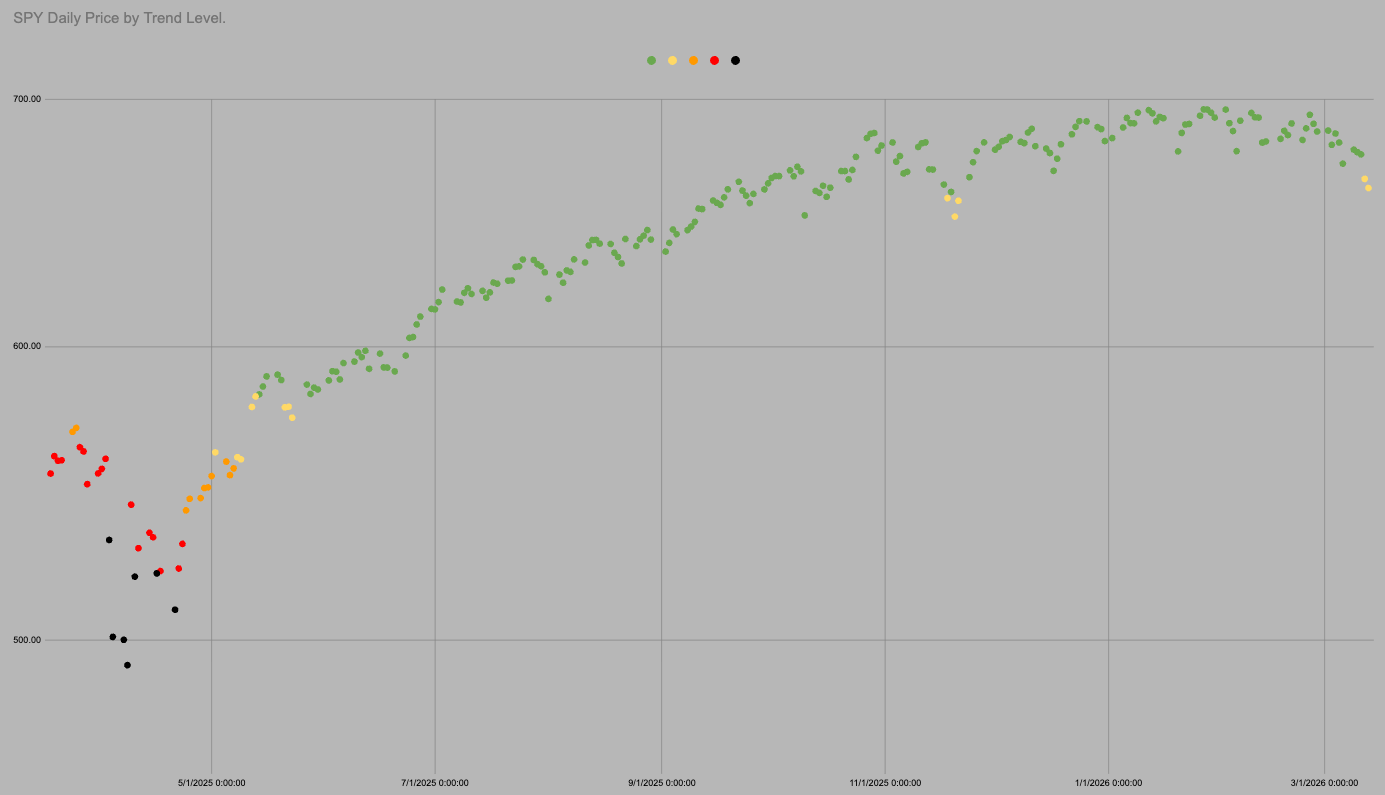 It is all the same chart so I can use all the same data. In the last 1761 trading days SPY has been above “trend” i.e. in green or yellow 83% of days.
