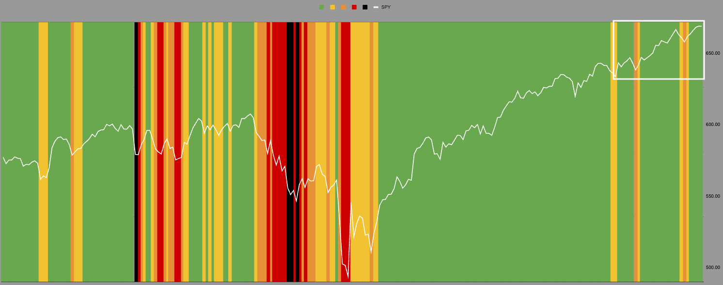 We remain in the green zone where SPX spends 65% of its trading time. This zone has a narrow but positively skewed distribution.
