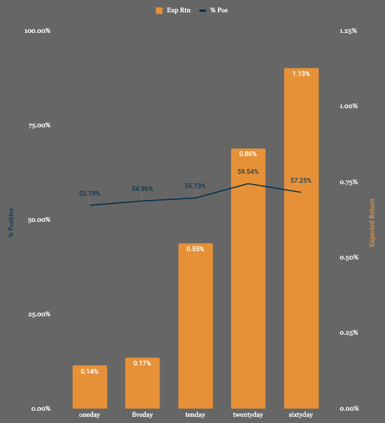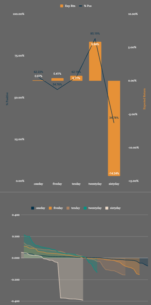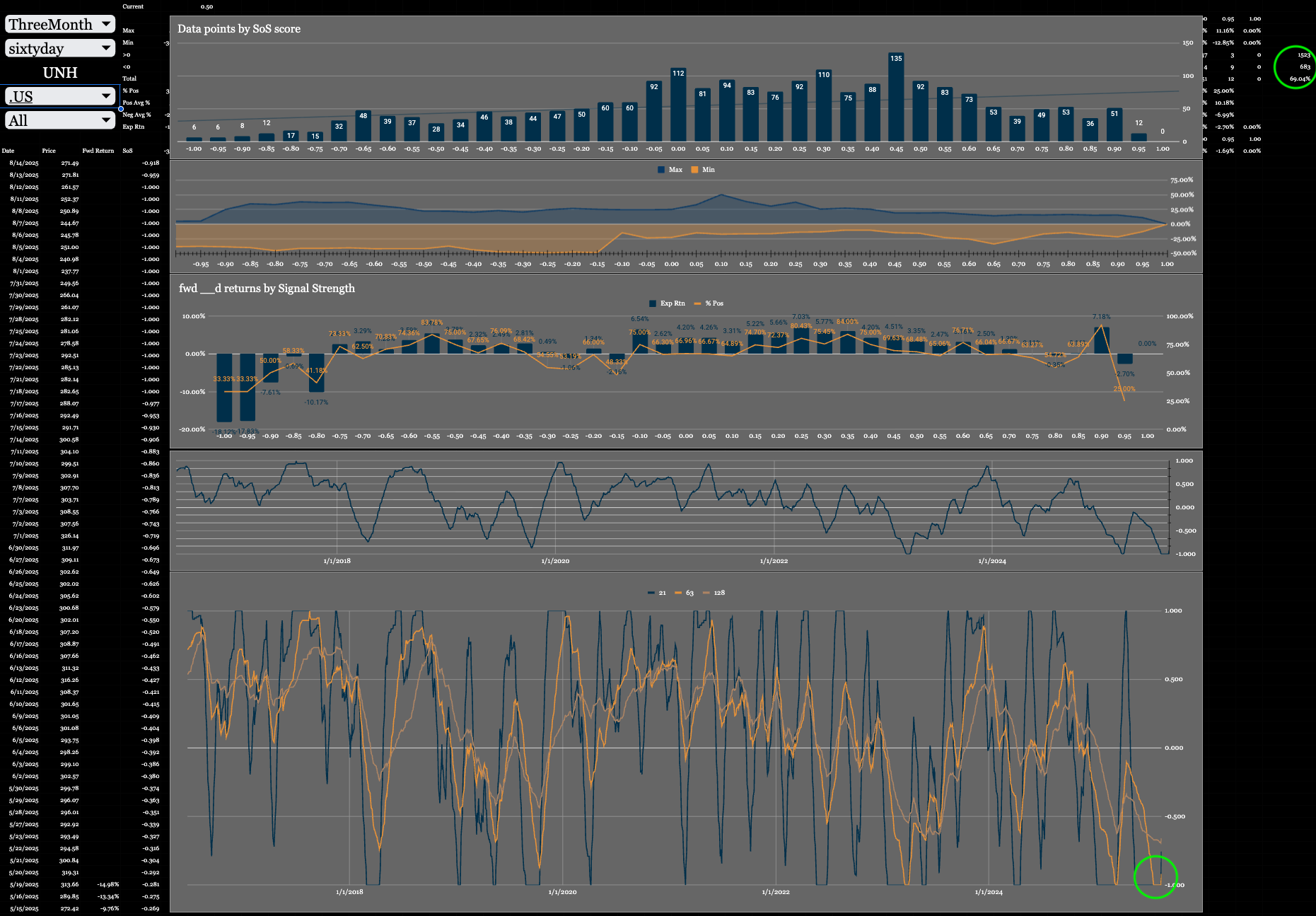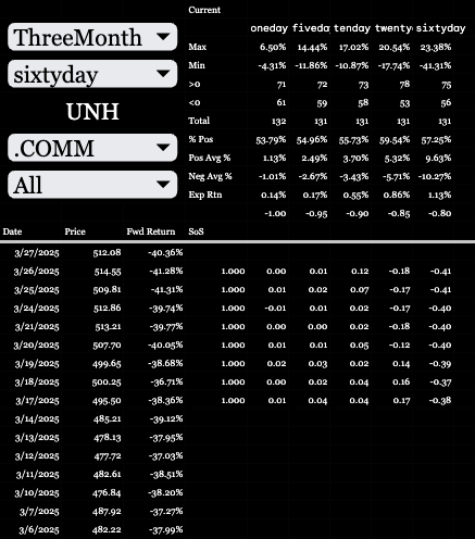 UNH after this trigger has an 85% to be higher over the next 20 days but only a 35% chance of being higher over the next 60 days.